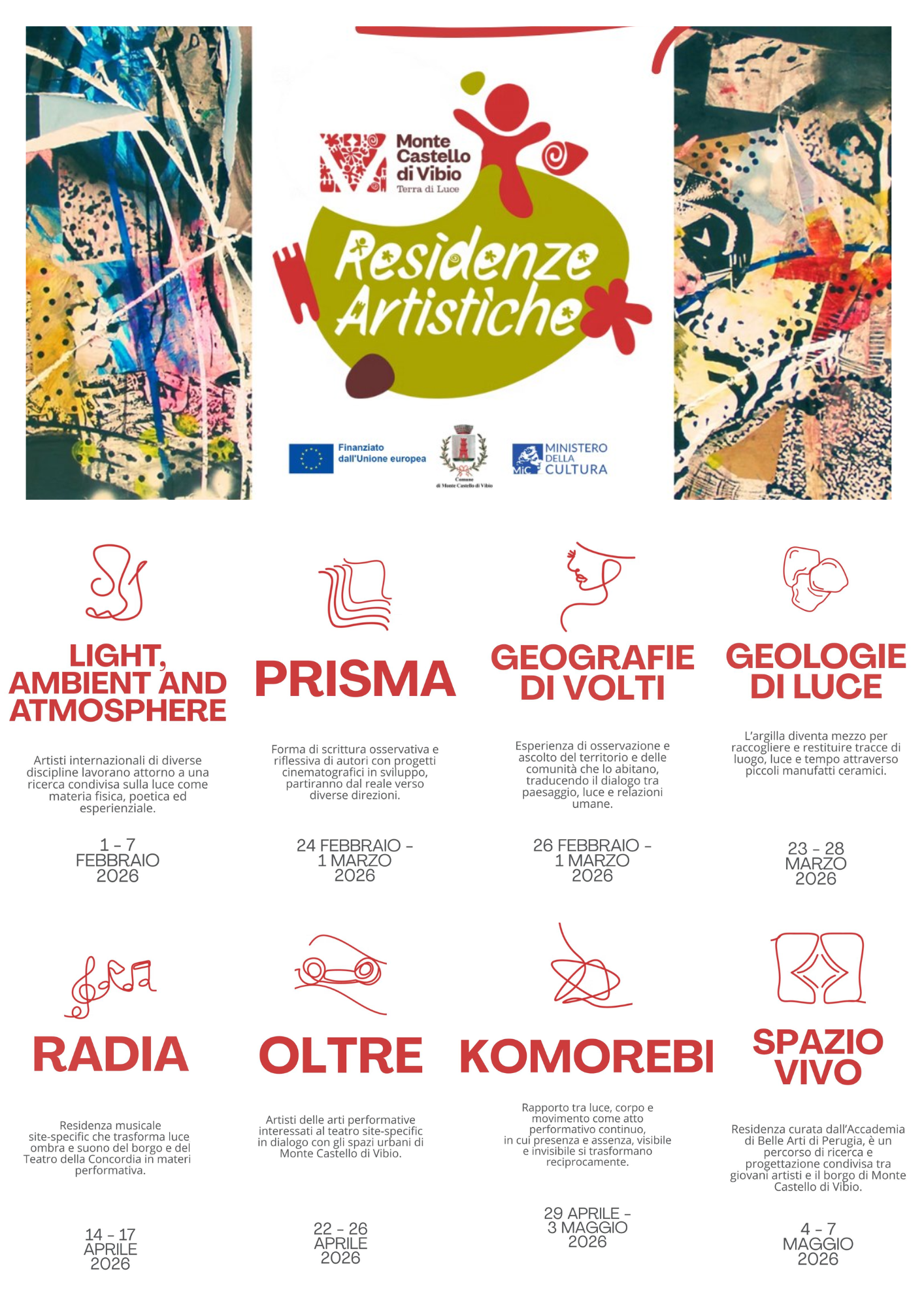Dal 1 Febbraio al Maggio 2026 il nuovo progetto ART ACADEMY dà il via a otto residenze artistiche sul territorio: otto gruppi di artisti introducono la loro arte sviluppando progetti ispirati al tema della luce, tra pittura, scultura, danza, performance e scrittura, facendo di Monte Castello Di Vibio luogo di ispirazione creativa.